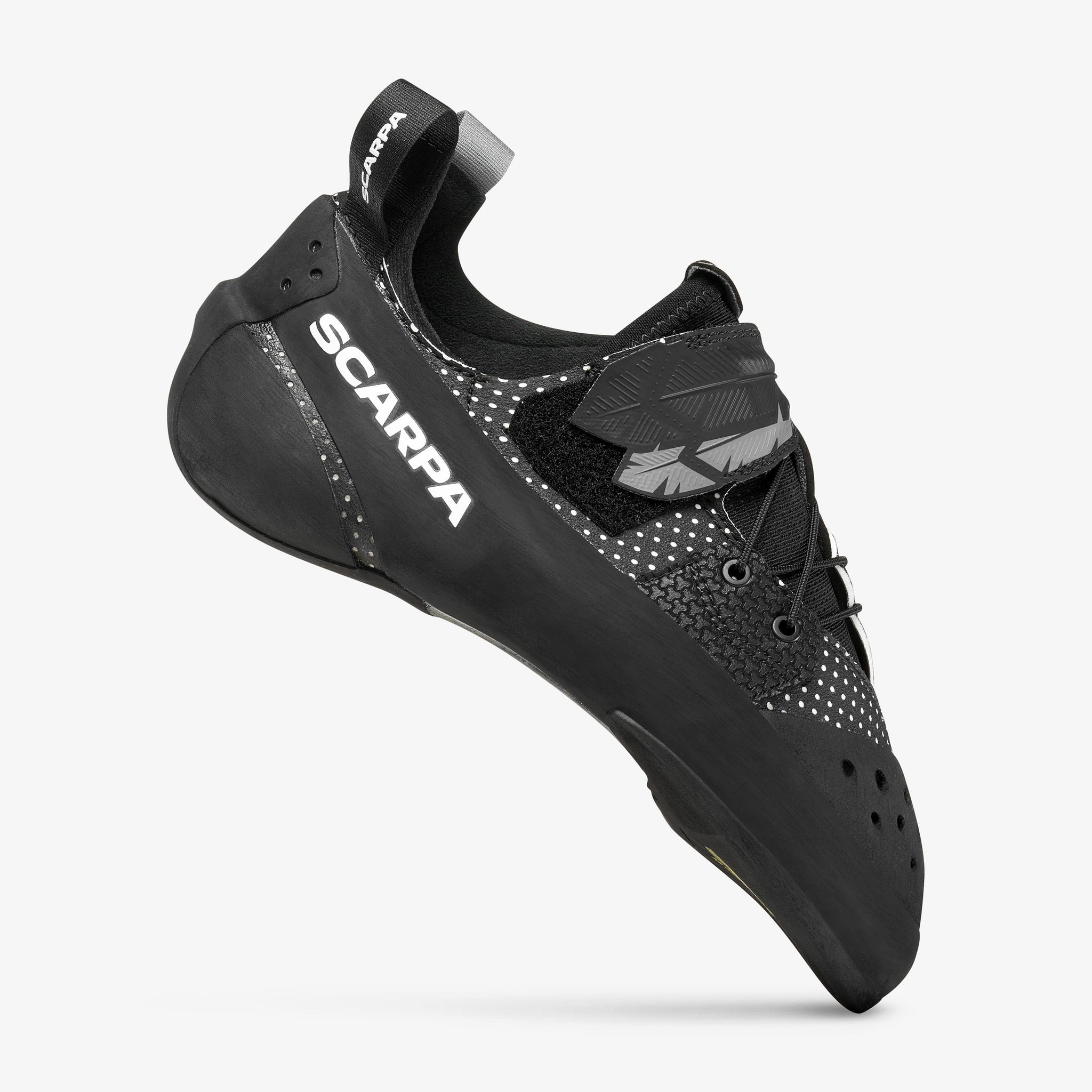 Le reste du chausson est à la hauteur de sa semelle. On retrouve une tige en microfibre double couche qui garantit durabilité et un maintien constant dans le temps. L’intérieur est doublé en Alcantara® au niveau des orteils et du talon pour plus de confort. Un stabilisateur latéral interne vient renforcer le chausson lors des mouvements en torsion ou des contre-pointes. Pour l’adhérence, SCARPA a fait confiance à la référence du marché : la gomme Vibram® XS Grip 2, réputée pour son grip exceptionnel. Le talon, quant à lui, intègre un « heel catch » pour une puissance accrue lors des crochetages.
